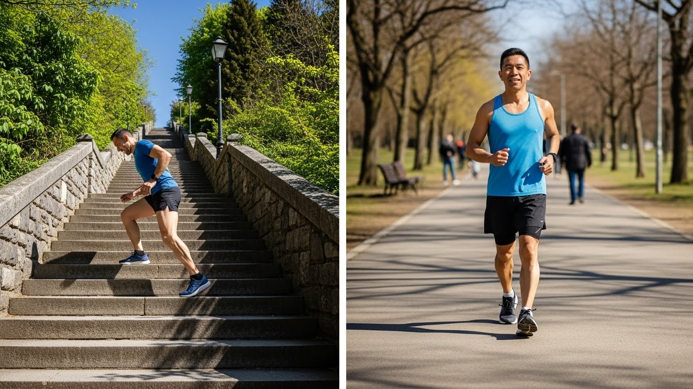 스위스의 한 연구팀은 12주 동안 직장인들을 대상으로 엘리베이터 대신 계단을 이용하도록 한 실험을 진행했습니다. 참가자들은 하루 평균 20층 정도의 계단을 오르내렸고, 실험 종료 후 체지방률이 평균 2퍼센트 감소하고 심폐 기능이 유의미하게 향상되었습니다. 또한 허리둘레가 평균 1.8센티미터 줄어드는 효과를 보였습니다. 일본의 한 장수 마을 연구에서는 경사가 심한 지역에 사는 노인들이 평지에 사는 노인들보다 심혈관 질환 발생률이 낮고 하체 근력이 우수하다는 결과가 나왔습니다. 반면 영국의 대규모 연구에서는 하루 1만 보 이상 꾸준히 걷는 사람들의 전반적인 건강 지표가 우수하다는 것이 밝혀졌습니다. 이러한 연구들은 두 운동 모두 건강에 큰 이점이 있음을 보여줍니다.