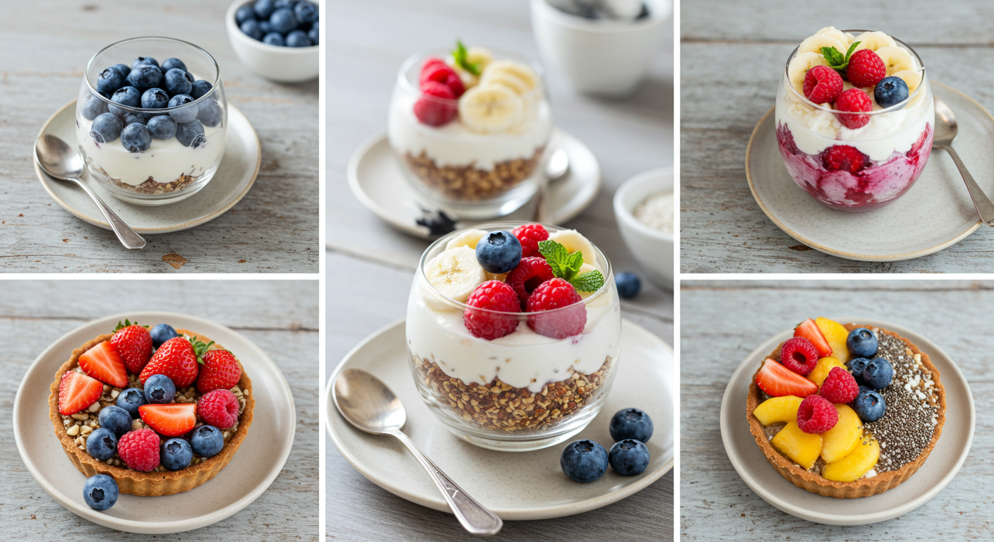 그리스 요거트는 건강한 디저트의 만능 재료입니다. 일반 요거트보다 단백질 함량이 두 배 높고, 프로바이오틱스가 장 건강을 개선합니다. 베리와 견과류를 토핑으로 올리면 완벽한 건강 디저트가 완성됩니다.