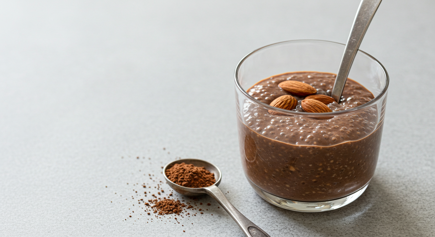 재료: 치아시드 3큰술, 아몬드 우유 1컵, 코코아 파우더 2큰술, 메이플 시럽 2큰술, 바닐라 에센스 1작은술