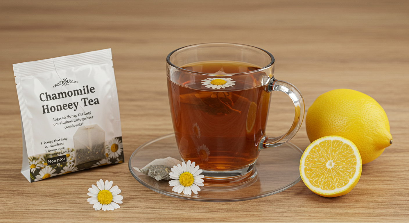 재료: 캐모마일 티백 1개, 뜨거운 물 200ml, 꿀 1티스푼, 레몬즙 약간