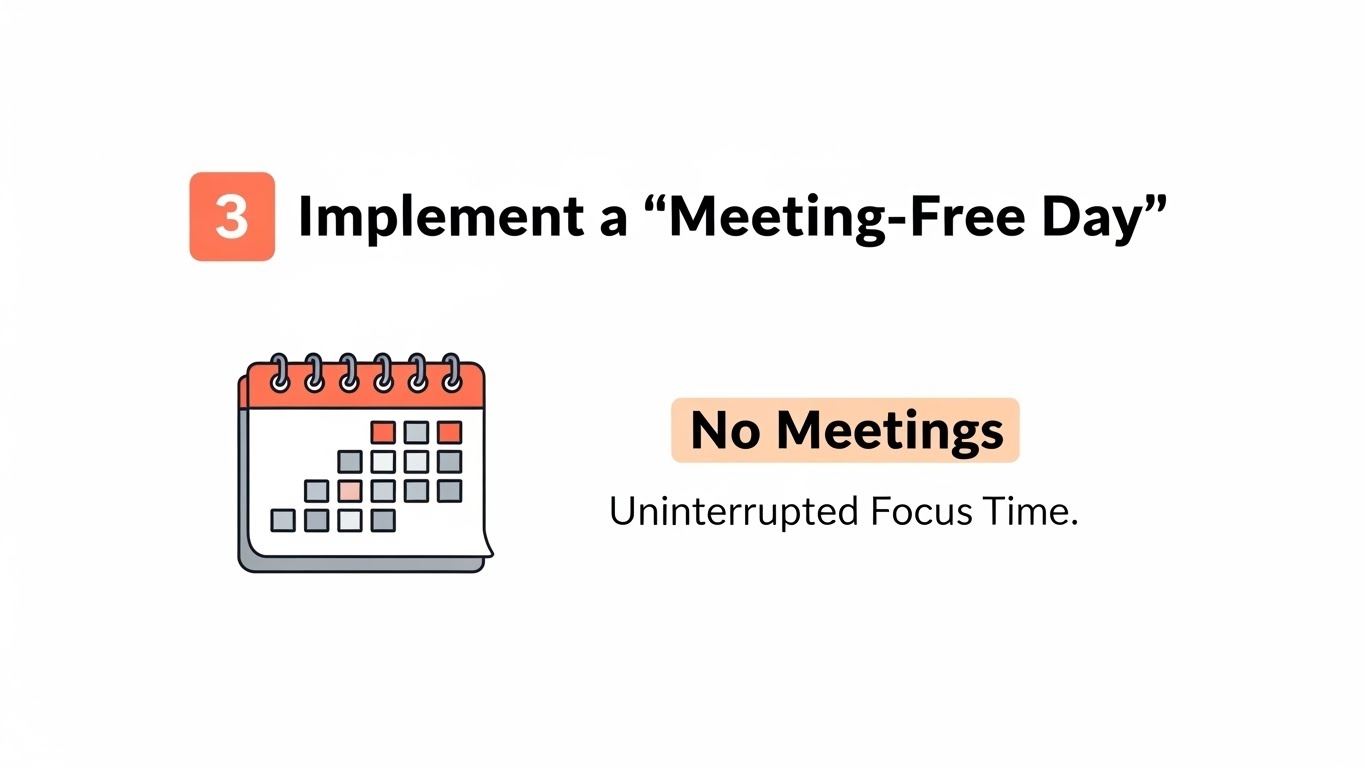 페이스북의 최고운영책임자였던 셰릴 샌드버그는 수요일을 회의 없는 날로 지정했습니다. 이날은 어떤 회의도 잡지 않고 오롯이 집중 업무에만 몰두하는 날입니다. 회의가 하루 종일 흩어져 있으면 업무 집중도가 떨어지고 생산성이 크게 감소합니다. 회의와 회의 사이의 자투리 시간에는 깊이 있는 작업을 하기 어렵기 때문입니다. 일주일에 하루 정도는 팀 전체가 회의 없는 날로 정하여 각자의 업무에 집중할 수 있는 시간을 확보하는 것이 중요합니다. 만약 회사 전체적으로 시행하기 어렵다면 개인적으로라도 특정 요일 오전이나 오후를 회의 없는 시간으로 캘린더에 블록해두는 것이 좋습니다. 이를 통해 방해받지 않고 중요한 프로젝트에 몰입할 수 있는 시간을 확보할 수 있습니다.