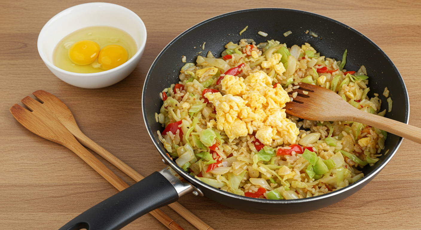 1. 달걀을 풀어 스크램블을 만들어 따로 둡니다. 2. 팬에 올리브유를 두르고 양파를 볶다가 향이 나면 양배추와 파프리카를 넣어 중불에서 볶습니다. 3. 채소가 숨이 죽으면 밥을 넣고 골고루 섞어가며 볶습니다. 4. 저염 간장과 후추로 간을 맞추고 스크램블을 넣어 가볍게 섞으면 완성입니다. 일반 간장 대신 저염 제품을 사용하고, 소금은 넣지 않아 나트륨을 최소화했습니다. 양배추는 칼륨이 낮아 신장에 부담이 없으며, 다양한 색상의 채소로 영양과 식감을 살렸습니다.