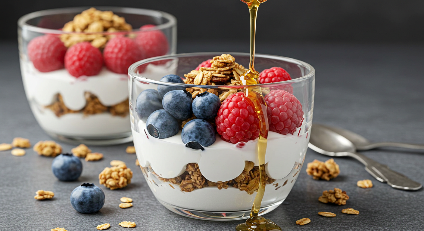 1. 투명한 컵이나 유리그릇 바닥에 요거트를 1/3 정도 담습니다. 2. 블루베리와 라즈베리를 섞어 올리고, 그 위에 그래놀라를 뿌립니다. 3. 같은 방식으로 한 번 더 층을 쌓고 마지막에 꿀을 살짝 뿌려 완성합니다. 베리류는 칼륨이 낮고 항산화 성분이 풍부하여 신장 보호에 좋으며, 무가당 요거트는 단백질과 칼슘을 적절히 공급합니다. 간식이나 가벼운 아침 식사로 적합하며, 5분 안에 완성할 수 있어 바쁜 아침에도 건강한 식사를 할 수 있습니다.