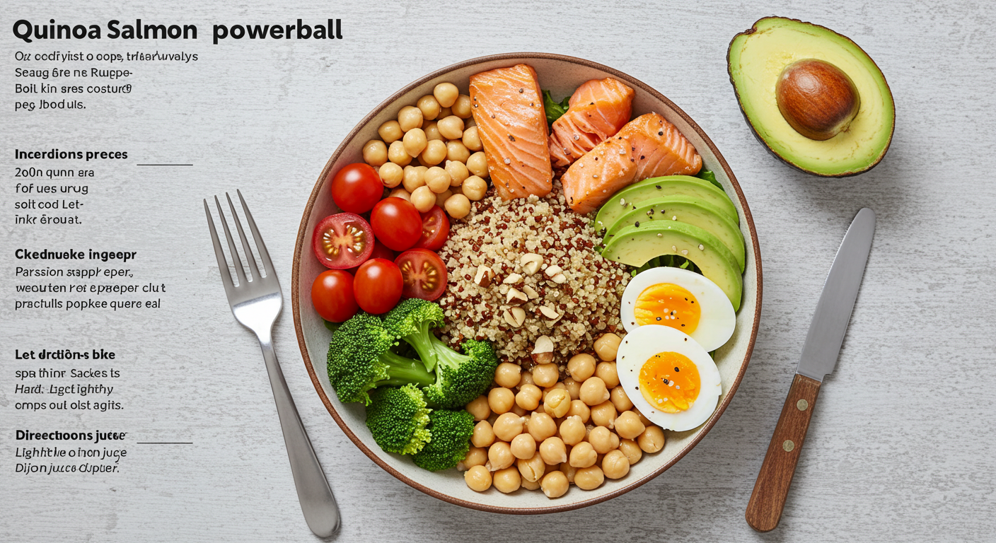 퀴노아 1컵, 연어 필레 200g, 아보카도 1개, 삶은 달걀 2개, 브로콜리 100g, 방울토마토 10개, 병아리콩 100g, 견과류 한 줌, 올리브오일 2큰술, 레몬즙 1큰술, 디종 머스타드 1작은술, 소금 후추 약간